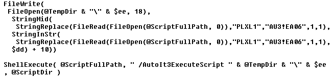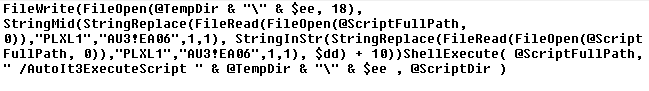 - The content stored in the original file contains a second marker ‘PLXL1’ which is replaced (before writing) with ‘AU3!EA06’ – replacing ‘PLXL1’ with ‘AU3!EA06’ suggests that the newly created temporary file is in fact a compiled AutoIt script (yet another one)