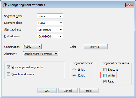 • Make the segment where the string is recognized read-only (by disabling ‘Write’ in segment properties):