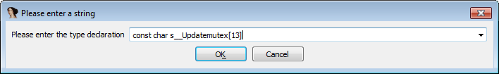 (the ‘s__’ prefix comes from the string prefix I typically use i.e. ‘s->’ which decompiler ‘flattens’ to ‘s__’). The s__Updatemutex refers to a string as shown below i.e. “UpdateMutex:” :