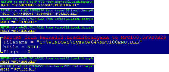 To test, you can load the mfc DLL into OllyDbg, put a breakpoint on LoadLibraryA/W (and LoadLibraryExA/W for newer versions, and A/W for Ansi or Unicode respectively) and see what happens – the below screenshot shows various versions of MFC DLL loading the localization DLLs – first five are from English OS and the last two from Russian: