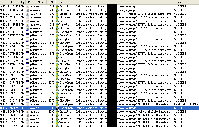 Running actual Java program causes the java.exe to look for ‘f9b9f6b8ff8b2b60.timestamp’ (refer to Procmon screenshot above) – this is randomly named file as well so if you look at the folder, you should see 2 of them.