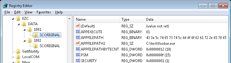 The key DATA\1001\SCORIGINAL changes to DATA\1002\SCORIGINAL for the second connection and increases for subsequent connections. This is how it looks like inside the Registry: