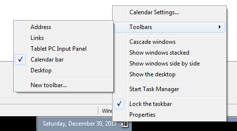 There are many coders who already did a great job explaining what desk bands are and how to implement them, so instead of pretending that I know what I am talking about, I will just suggest that you read this great article ‘Shell Extensibility – Explorer Desk Band, Tray Notification Icon et al.‘ by Alex Blekhman. When you run the Calendar.exe that is attached to the article you will then have an option to make the calendar present as a Deskband