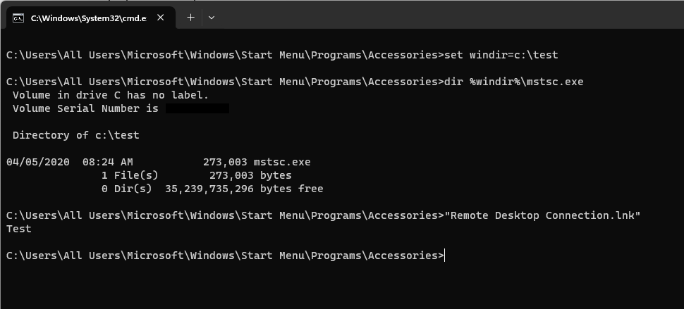 So, changing the windir to point to c:\test and placing our payload in c:\test\system32\mstsc.exe will make the following work: