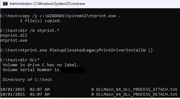ntprint.exe lolbin Posted on 2025-10-06 by adam You can copy c:\WINDOWS\system32\ntprint.exe to a folder of your liking f.ex. c:\test, and then launch it with command line arguments like this: ntprint.exe PSetupElevatedLegacyPrintDriverInstallW {} This will load c:\test\ntprint.dll: