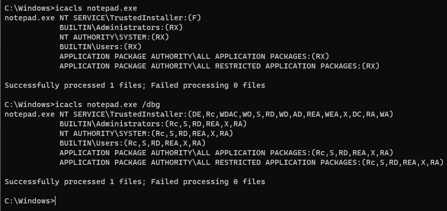 icacls notepad.exe /dbg