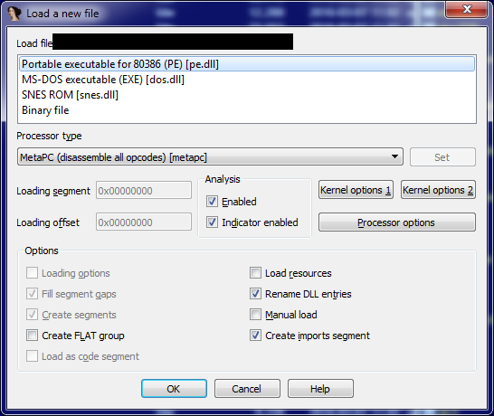 When you launch IDA and then load the sysmon.exe into it, you will see the following dialog box: